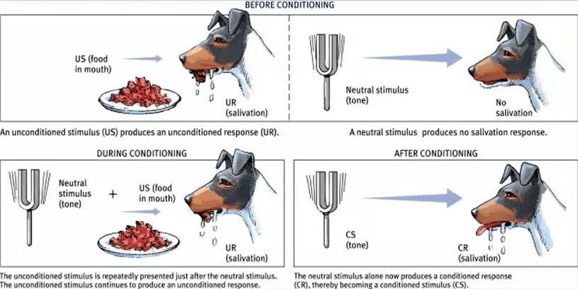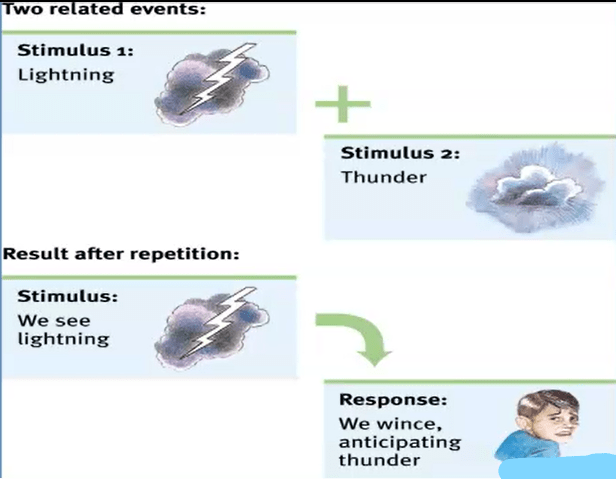 Let’s now dive deeper into classical conditioning! Through classical conditioning, people and animals can acquire certain behaviors. This is a learning process in which associations are made between an unconditioned stimulus and a neutral stimulus. To understand what this means, we need to define 6 key terms. A stimuli is something that elicits a response. A neutral stimulus (NS) is something that initially does not elicit a response. An unconditioned stimulus (UCS) is something that elicits a predictable or natural response without training. Similarly, an unconditioned response (UCR) is the automatic or natural reaction to a stimulus without training. For instance, if you hear a loud noise, you will jump. The loud noise is the UCS while you jumping is the UCR. On the other hand, a conditioned stimulus (CS) is something that elicits a response due to being paired with and presented with a UCS while a conditioned response (CR) is the learned reaction to that specific conditioned stimulus. A good example of the connection between the UCS and CS is seen with lightning and thunder. Thunder is the UCS which elicits the response of an individual covering their ears when they hear it, which is the UCR. If we pair the thunder with the second stimulus of lighting, which will present itself before thunder, initially, an individual will continue to cover their ears not when they see the lightning but when they hear the thunder afterwards. So if we go back to our definitions, lightning is initially a NS. If we repeatedly present lightning and then thunder several times to an individual, after this repetition, if that individual sees lightning, they will automatically cover their ears, even before they hear the thunder, because they have learned the association between the two stimuli. After this repetition, lightning has become a CS and the covering of the ears has become a CR. This idea suggests that a response can become conditioned with the repetitive pairing of a UCS with another stimulus, which becomes a CS through repetition.