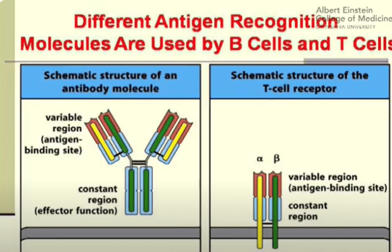 Let’s first discuss T cells! T cells have cell surface receptors that that recognize primary structures via ligand-receptor binding. The cell surface receptors are the antigen recognition molecules of T cells. A primary structure refers to the amino acid sequence of a protein, which are a type of antigen. These foreign proteins are broken down and digested into its simplest amino acid sequence, which is then presented in as a major histocompatibility complex molecule, which is presented as a cell surface protein on antigen presenting cells, such as macrophages and dendritic cells, which are members of the fast acting innate immune system. A key component of the immune system’s function is the communication between its innate and adaptive cell types, evident in T cell antigen recognition. On the other hand, B cells use an immunoglobulin molecule, more commonly known as an antibody, to recognize the soluble 3D structures of the native antigen molecules. Unlike T cells, the antigen recognition molecules of B cells are the antibody molecules that it secretes.