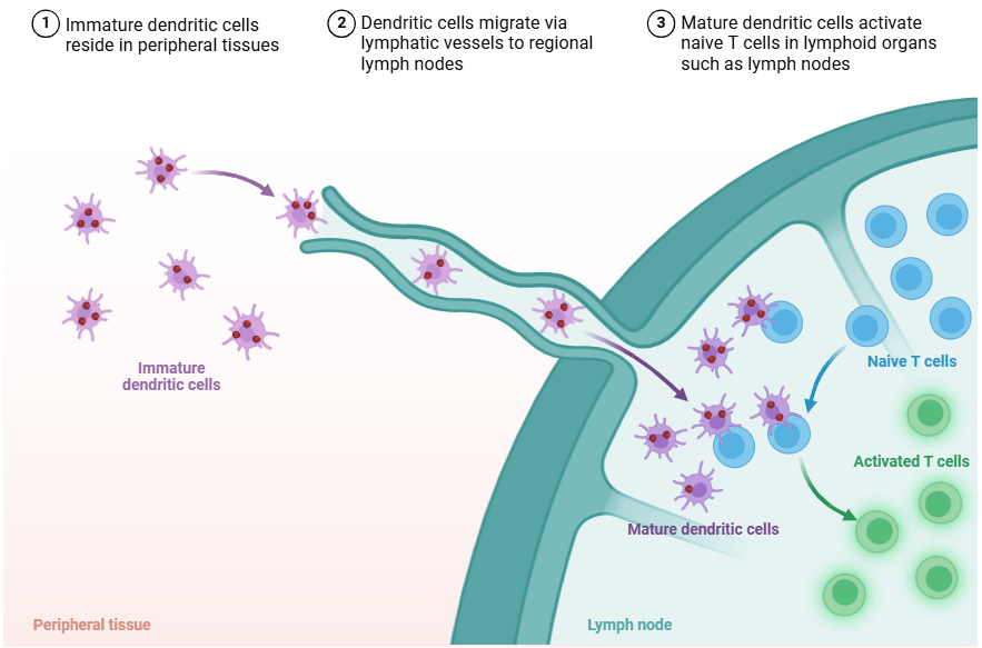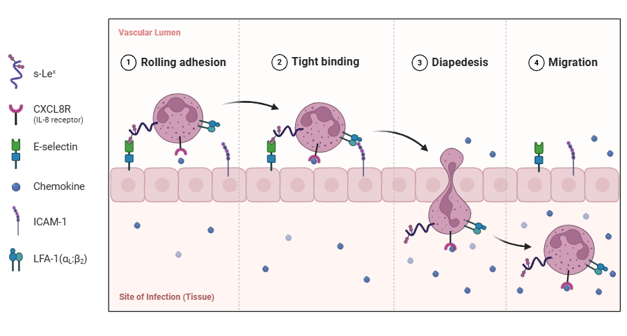 - Recruitment of Additional Immune Cells: Tissue macrophages and dendritic cells recruit additional immune cells from the bloodstream by releasing signaling molecules. Monocytes from peripheral blood migrate to the infection site through a process called extravasation, during which they roll along the blood vessel walls. Once the monocyte reaches the site of infection, it migrates from the blood vessel into the tissue through a process called diapedesis, where they differentiate into macrophages to help control and eliminate the infection.